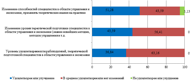 По данным мониторинга 36,84% руководителей сельскохозяйственных предприятий Омской области в целом удовлетворены практической подготовкой специалистов в области управления и экономики; 60,53% – в среднем удовлетворены; 2,63% – не удовлетворены практической подготовкой специалистов в области управления и экономики.