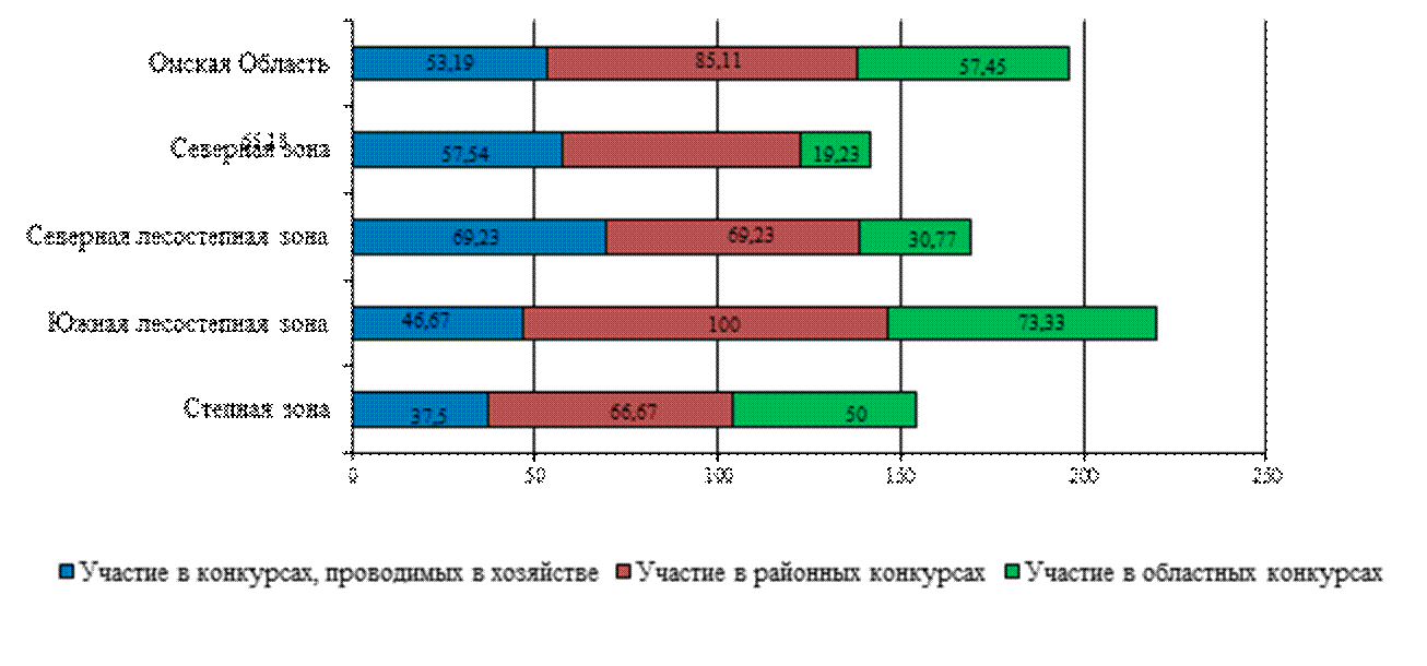 По данным опроса, было установлено, что работники более 78% сельскохозяйственных предприятий участвуют в конкурсах профессионального мастерства различных уровней: 53,19% хозяйств проводят конкурсы профессионального мастерства между своими работниками, работники 85,11% хозяйств участвуют в районных конкурсах, работники 57,45% хозяйств – в областных (Рисунок 8).