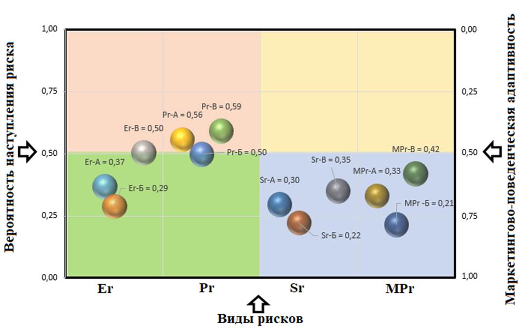 а) построение матрицы «вид риска – маркетингово-поведенческая адаптивность», представленной на рис. 1, по параметрам вероятности наступления рисков для каждой группы влияющих факторов (Er , Pr , Sr, MPr ) в разрезе регионов (А, Б и В);
