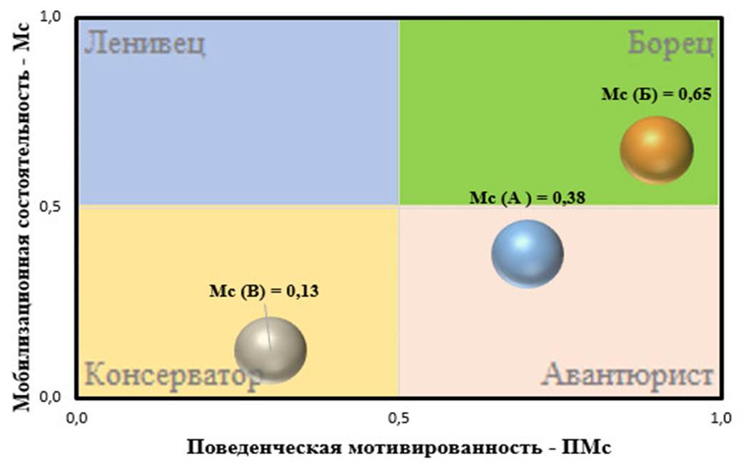 г) построение стратегической матрицы «поведенческая мотивированность-мобилизационная состоятельность» для регионов А, Б, В с учетом параметров интегральных индексов рисков, полученных по совокупности составляющих его видов рисков (экономического Er, социального Sr, политического Pr и маркетингово-поведенческого MPr). В матрице выделены 4 квадранта, получивших следующие наименования: авантюрист – соответствует поведенческой мотивированности хозяйствующего субъекта более 0,5 при мобилизационной состоятельности менее 0,5; консерватор ‒ соответствует поведенческой мотивированности хозяйствующего субъекта менее 0,5 при мобилизационной состоятельности менее 0,5; борец – соответствует поведенческой мотивированности хозяйствующего субъекта менее 0,5 при мобилизационной состоятельности менее 0,5; ленивец ‒ соответствует поведенческой мотивированности хозяйствующего субъекта менее 0,5 при мобилизационной состоятельности более 0,5.