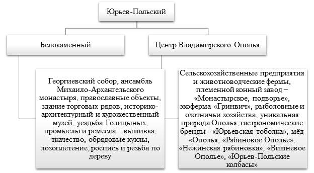 Юрьев-Польский муниципальный район Владимирской области обладает уникальными тематическими ресурсами для развития данной сферы. С опорой на туристскую специализацию района предложены два флагманских направления его продвижения «Юрьев-Польский – белокаменный» и «Юрьев-Польский – центр Владимирского Ополья», обусловленных богатым культурно-историческим потенциалом территории и особенностями географии места.