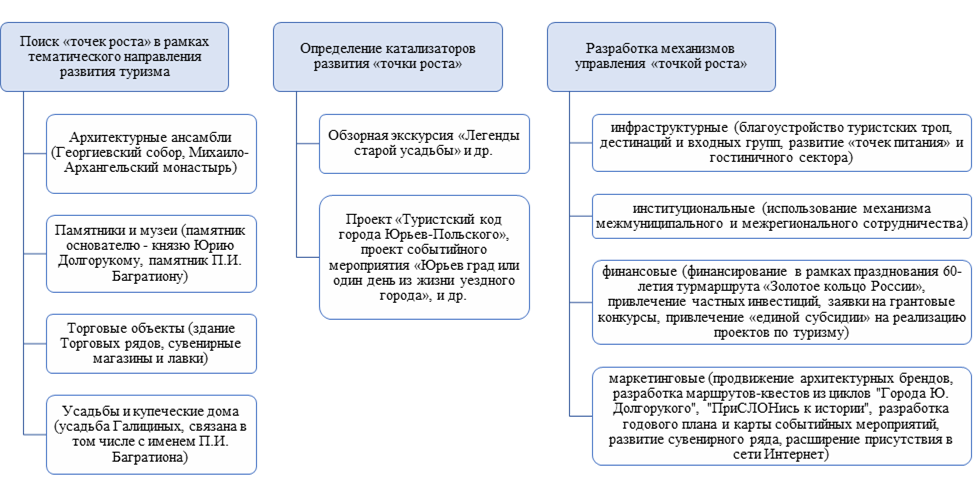 Для выявления «точек роста» были проанализированы публикации отечественных и зарубежных исследователей, документы стратегического планирования района [12], опираясь на содержание которых определены «точки роста» туристского сектора Юрьев-Польского района и механизмы их укрепления.