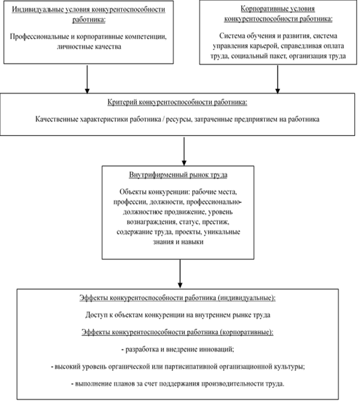 Конкурентоспособность работника – способность выигрывать у конкурентов экономическое состязание за «хорошие» рабочие места, соответствующие профилю его профессиональной подготовки, за счет наилучшего соответствия совокупных качественных характеристик рабочей силы производственному потенциалу конкурентных рабочих мест и субъективным предпочтениям работодателя [10]. Конкурентоспособность работника – это способность наращивать работниками полезные свойства, востребованные на внутреннем и внешнем рынках труда в условиях состязательности, с помощью внутриорганизационных и внешних условий для профессиональной внутриорганизационного развития н повышения материального благосостояния [15].