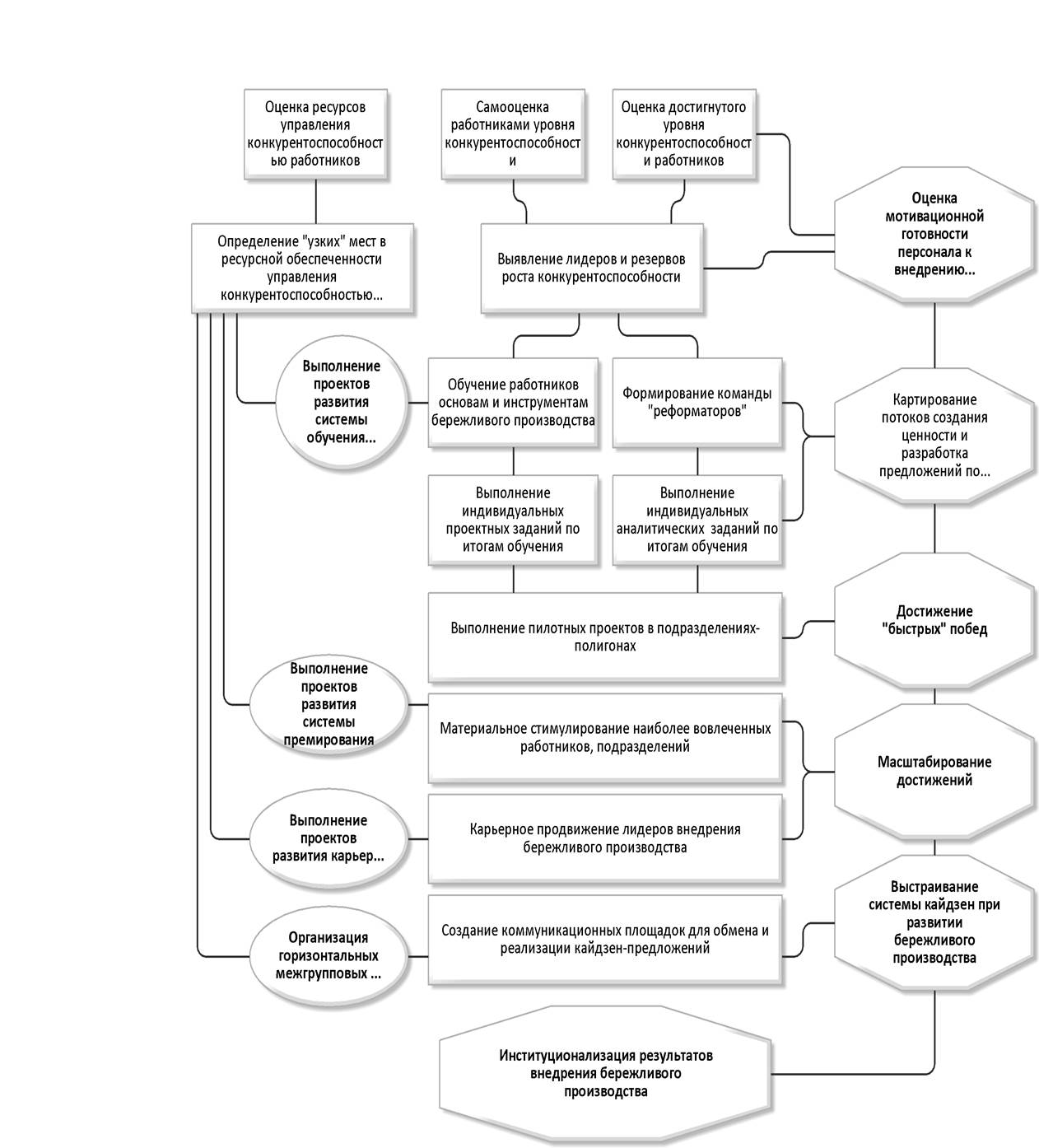 Для вовлечения работников в «пул» сторонников бережливых изменений также можно использовать результаты оценки и самооценки конкурентоспособности. Так формируется команда реформаторов или, возможно, целые командные кластеры по подразделениям. Как известно, при внедрении бережливого производства обязательно тотальное обучение персонала основам и технологиям анализа процессов, поиска потерь и организации коммуникаций. Мы считаем, что важно провести не просто обучение в форме повышения квалификации, а проектно-ориентированный курс по результатам которого слушатели, которые обладают высоким уровнем конкурентоспособности, выполняют индивидуальные проекты совершенствования цепочек создания ценности. А те слушатели, чей уровень оценки ниже, выполнят аналитические задания. Оба формата работ в совокупности позволят определить точки роста производительности на уровне конкретных процессов, позволят обосновать реинжиниринг или простую модернизацию процессов. Как уже отмечено нами ранее, такие проекты, в первую очередь разворачиваются в подразделениях, где есть сильная поддержка, тогда можно добиться быстрых побед, заключающихся в результативных изменениях, способных выступить драйверами дальнейшего распространения проекта.