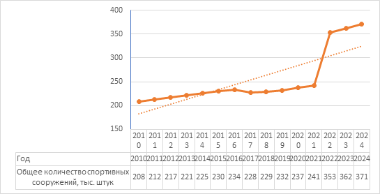 Рисунок 1. Динамика числа спортивных объектов в Российской Федерации за 2010-2024 гг.