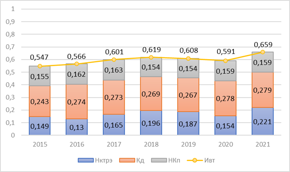 1. Выявлена общая положительная динамика структурных преобразований - за период 2015-2021 гг. индекс ИВТ вырос с 0,547 до 0,659, что свидетельствует о переходе из зоны «умеренного» в зону «высокого» уровня качества структуры торговли. Наибольшее значение достигнуто в 2021 году (0,659), минимальное - в 2015 году (0,547).