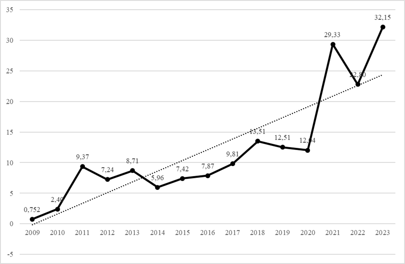 According to the Federal Tax Service of Russia's Form 5-P report, in 2023, Russian organizations' R&D expenditures, as defined by the Government of the Russian Federation, amounted to 32 billion rubles. Moreover, over the past 15 years, the average annual growth rate of R&D expenditures, which is demonstrated in Figure 3, was 51.42%.
