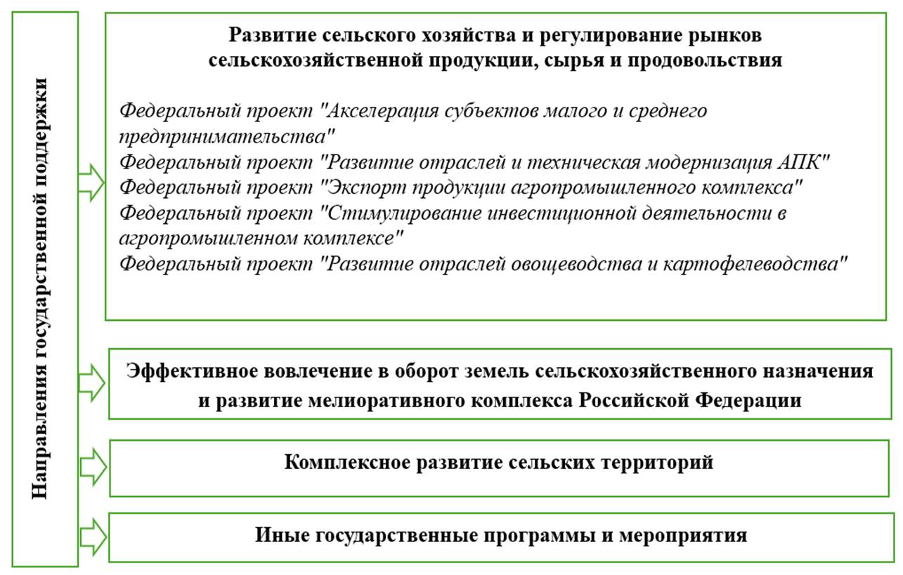 Государственное финансирование в регионе осуществляется по четырем направлениям (рис. 2). Первое направление «Развитие сельского хозяйства и регулирование рынков сельскохозяйственной продукции, сырья и продовольствия» является преобладающим и осуществляется в области в рамках пяти федеральных проектов. Наибольшая сумма средств предоставляется по федеральному проекту «Развитие отраслей и техническая модернизация АПК» - 65,1 % от общей суммы поддержки, который включает в себя: субсидии на поддержку отдельных подотраслей растениеводства и животноводства (компенсирующая субсидия); субсидии на стимулирование развития приоритетных подотраслей АПК и развития малых форм хозяйствования (стимулирующая субсидия); субсидии на возмещение производителям зерновых культур части затрат на производство и реализацию зерновых культур.