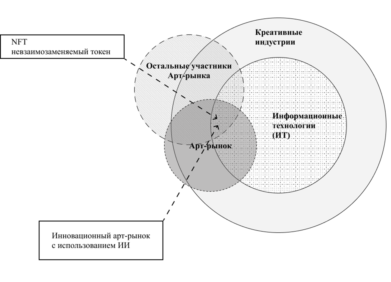 Рисунок 1. Роль генеративного искусства и NFT в синергии арт и ИТ рынка, как части креативных индустрий. Источник: составлено автором
