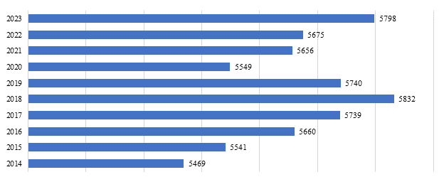 Анализируя официальную статистическую информацию Росстата, авторами обращено внимание на динамику численности занятых отрасли «Деятельность в области здравоохранения и социальных услуг» за 2014-2023 гг. (рисунок 1).