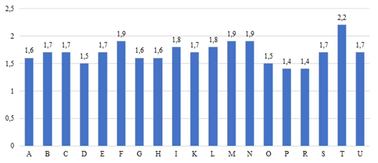 Изображенная на рисунке 2 мера ориентированного компетентностного различия исследуемой отрасли больше всего расходится с отраслью «Деятельность домашних хозяйств как работодателей; недифференцированная деятельность частных домашних хозяйств по производству товаров и оказанию услуг для собственного потребления» (ОКВЭД Т). Профессиональная специфика трудовых ресурсов и отсутствие отраслевых связей объясняют формирование высокого значения. Наименьшее значение меры ориентированного компетентностного различия исследуемой отрасли зафиксировано с такими видами деятельности как «Образование» и «Деятельность в области культуры, спорта, организации досуга и развлечений», что объясняется их социальной близостью. Так, имея определенную профессиональную квалификацию, трудовые ресурсы здравоохранения без особых профессиональных проблем могут перейти в образовательную сферу. А реализация социальных услуг может быть непосредственно связана с культурой, спортом и досугом, что определяет наличие низкого профессионального порога при перетоке трудовых ресурсов.