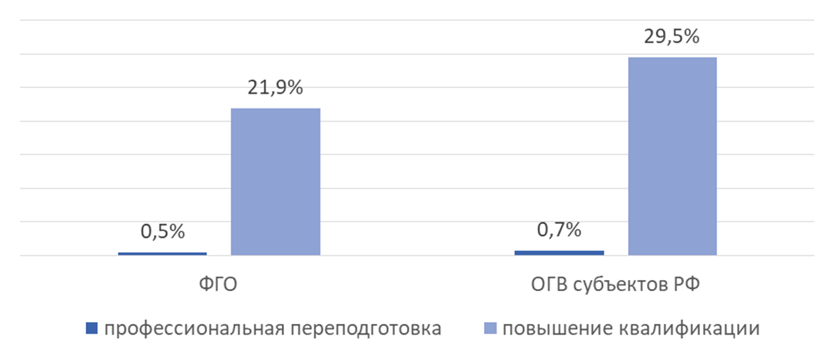Так, если в субъектах РФ наблюдается более сбалансированное вовлечение всех категорий служащих в обучение с фокусом на главную группу должностей (38%), то в ФГО преобладает обученние служащих главной (40%) и младшей (68%) группы должностей. Высокая доля служащих, прошедших обучение по программам профессионального развития в главной группе должностей, скорее всего свидетельствует о фокусе внимания на формирование крепкого звена среднего управленческого состава с перспективой карьерного роста. Значительный охват подготовкой младшей группы указывает на использование программ обучения как инструмента адаптации и повышения компетенций сотрудников, только начинающих свой путь на государственной гражданской службе. В целом можно отметить, что на федеральном уровне политика в области подготовки кадров более адресная и ориентированная на создание прочной базы перспективных кадров.