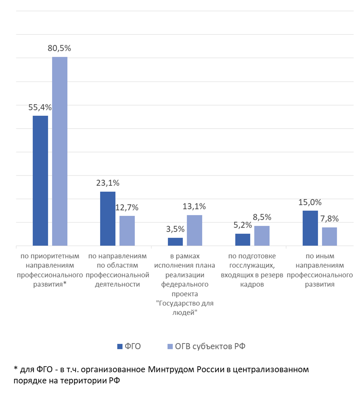 В целом по представленной структуре направлений подготовки в рамках реализации программ ДПО на государственной гражданской службе можно констатировать, что это является значимым ресурсом позволяющим, централизованно планировать подготовку, в том числе по приоритетным направлениям для государственного управления, контролировать качество образовательных программ и обеспечивать их соответствие стратегическим задачам органов власти. При этом программы ДПО имеют как правило «запаздывающий» характер, с низким уровнем соответствия «жизненным ситуациям», а, следовательно, и влияния на качество профессиональной деятельности [21].