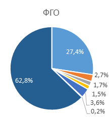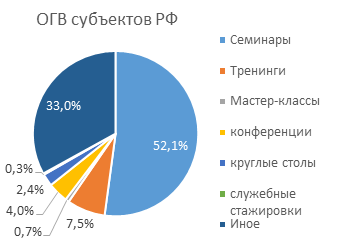 Анализ структуры таких мероприятий по профессиональному развитию гражданских служащих на федеральном и региональном уровне имеет существенные отличия (Рисунок 4). Так, если в ОГВ субъектов РФ более половины мероприятий – это семинары (52,1%), то в ФГО этот показатель составляет 27,4%, при этом значительная доля ускоренных программ в ФГО (62,8%) принадлежит широкому спектру нестандартизированных мероприятий (внутреннее обучение, практикумы, лекции приглашенных специалистов, вебинары, онлайн-курсы, развивающее тестирование, профессиональные конкурсы, ознакомительные поездки и т.д.).