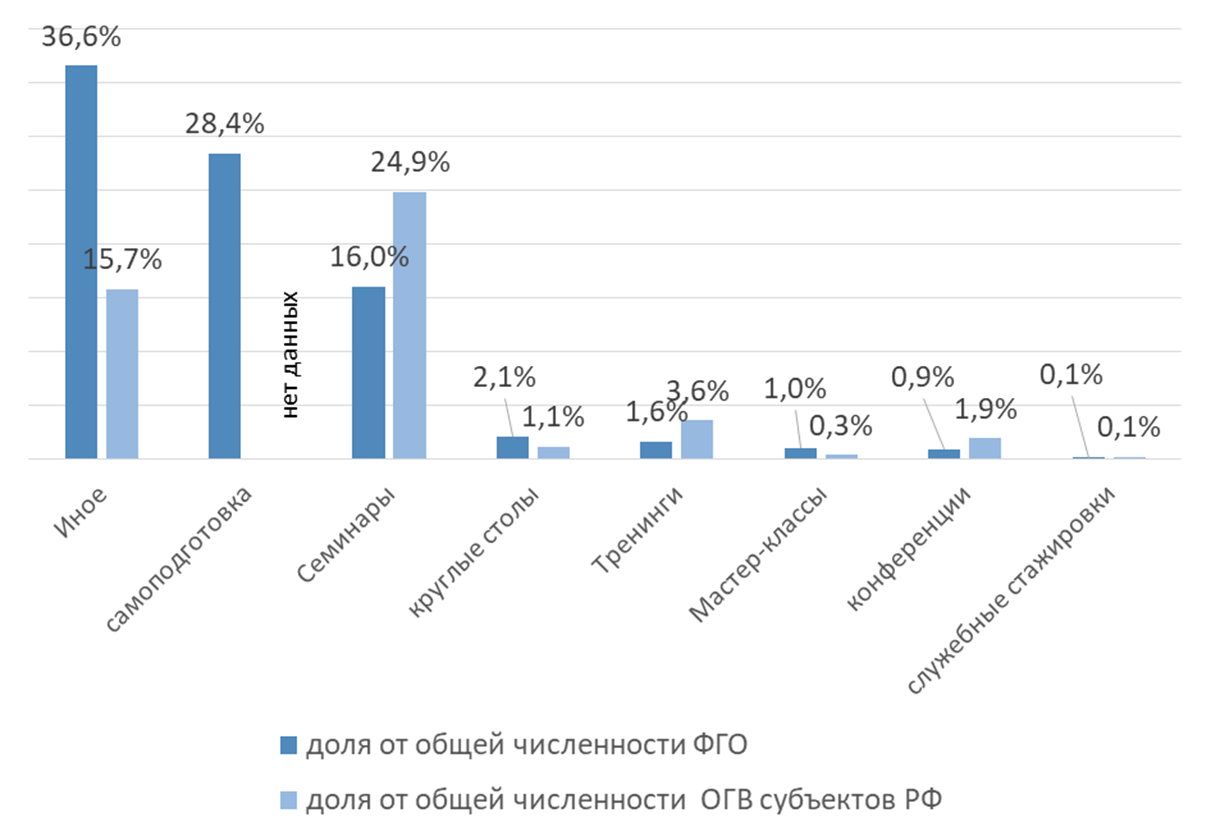 В то же время в практике профессионального развития гражданских служащих заметно увеличивается использование форм профессионального развития, направленных как на ускоренное приобретение новых знаний, умений (семинары, тренинги и т.п.) и изучение передового опыта, технологий государственного управления, обмен опытом (конференции, круглые столы, стажировки), так и на самостоятельное освоение образовательных программ [6]. Если в 2023 г. только 43 ФГО использовали отдельные мероприятия по профессиональному развитию – семинары, тренинги, круглые столы, конференции, мероприятия по обмену опытом (в том числе с использованием видео-конференц-связи), то в 2024 г. уже 63 ФГО [7].