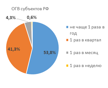 Однако важно оценивать не только показатель охвата определенными мероприятиями гражданских служащих, но и то, насколько системно и целенаправленно используется ресурс профессионального развития для решения конкретных задач государственного органа. Так, порядка 40% ФГО и 55% ОГВ субъектов РФ проводят такие мероприятия по профразвитию не чаще 1 раза в год, что не может обеспечить непрерывность процесса совершенствования компетенций, своевременность реагирования на меняющиеся задачи и прочное закрепление новых профессиональных навыков.