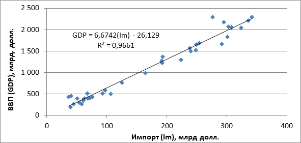 Рис. 1. Зависимость ВВП России от импорта за 1989-1924 гг.