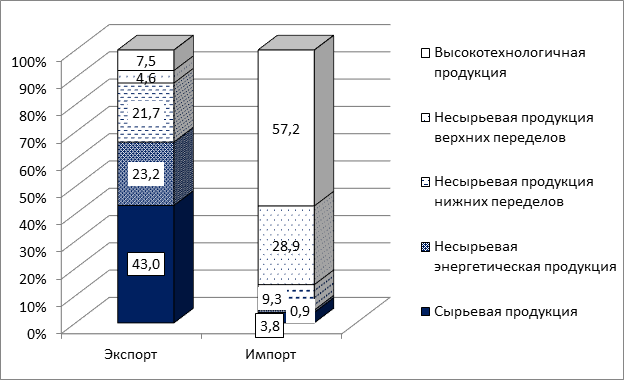 По нашим оценкам с использованием статистической базы данных [26], в товарном экспорте России доля высокотехногичной продукции составляет в среднем всего 7,5%, а несырьевой продукции верхних переделов – менее 5%. В целом доля высокотехнологичного российского экспорта вместе с несырьевой продукцией верхних переделов едва превышает 12%. Российский экспорт на 43% представлен сырьевой продукцией и еще более 23% составляет продукция несырьевого энергетического сектора.