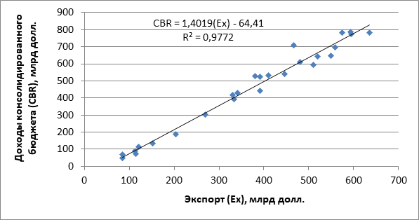 корреляции между объемами экспорта и доходами консолидированного бюджета