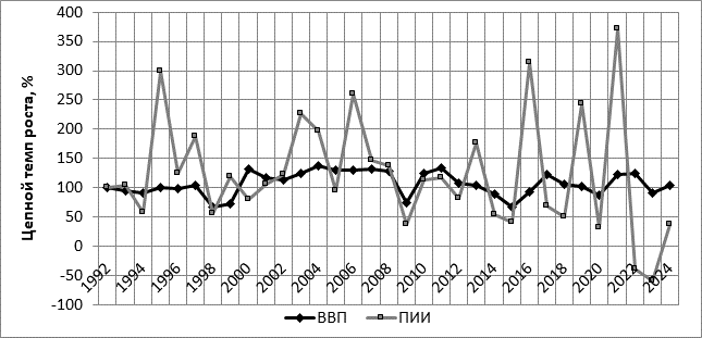 Рис. 4. Динамика цепных темпов роста входящих ПИИ и ВВП за 1992-2024 гг.