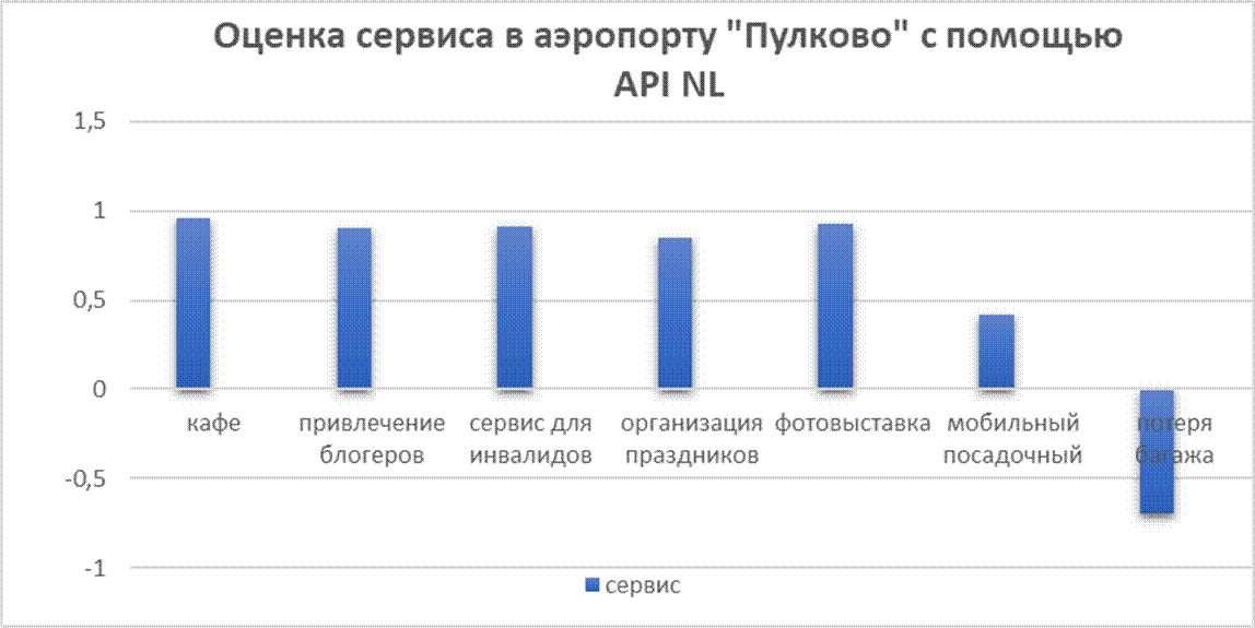 Проведя контент-анализ аэропортовых услуг, можно выделить основные сервисные предложения, которые оказываются в аэропорту «Пулково». Методом сентимент-анализа, являющегося частью контент-анализа, с помощью машинной обработки каждая услуга оценивалась системой от 0 до 1,0 балла по уровню тональности. Чем выше в СМИ уровень тональной эмоциональности, тем выше значение балла. Все сервисные услуги обладают положительной или нейтральной эмоциональной тональностью. Рассмотрим основные полученные значения по качеству сервисного обслуживания в аэропортах: