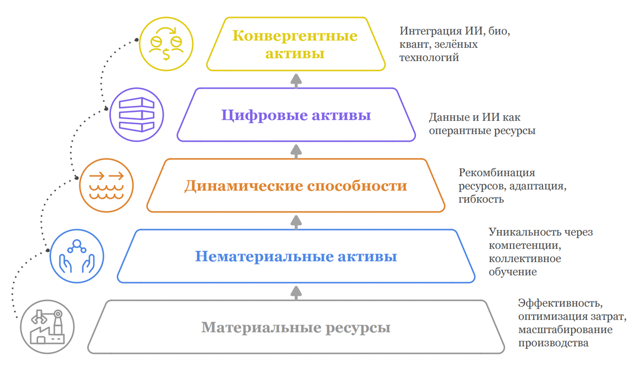 Первый уровень (период 1950-1980 гг.) определяется преобладанием осязаемых активов — производственных мощностей, финансового капитала, оборудования и физической инфраструктуры — как ключевого источника конкурентных преимуществ на стабильных индустриальных рынках с предсказуемыми траекториями развития. Э.Т. Пенроуз [15] обосновывала их вклад в рост фирмы посредством оптимизации производственных масштабов и снижения издержек, трактуя ресурсы как пассивные элементы балансового отчета. И. Диркекс и К. Кул [7] развили концепцию траекторий ресурсного накопления, продемонстрировав возникновение экономических рент из последовательных инвестиций, невосприимчивых к имитации в силу временных лагов, эрозии альтернативных путей и причинной неоднозначности. В российской литературе эти идеи коррелируют с теорией длинных циклов Кондратьева и технологическими укладами С.Ю. Глазьева [2], где материальные активы определяли конкурентоспособность в системных волнах развития, связывая эффективность с технологической базой.