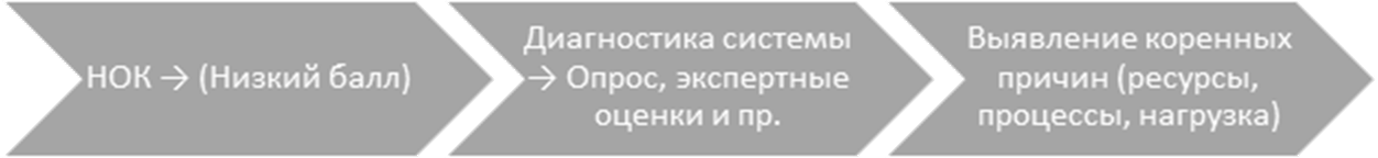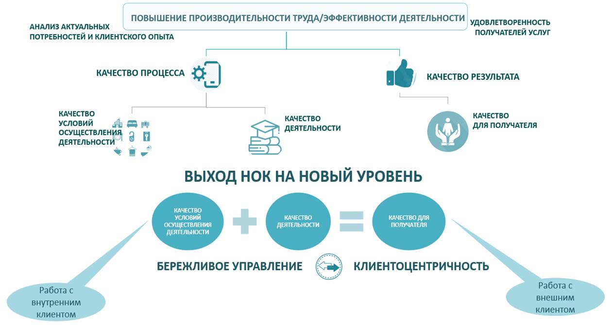 В рамках внедрения проектов, направленных на повышение производительности труда в организациях социальной сферы, в каждой сфере созданы отраслевые центры компетенций (ОЦК), которые помогают организациям провести диагностику, а также внедрять принципы бережливого производства, оформленные как «коробочные решения». Каждое коробочное решение помогает наладить, изменить, улучшить тот или иной процесс, в котором выявлены потери. Информационную основу диагностики потерь составляет совокупность статистических и аналитических данных, эмпирическое наблюдение и экспертные оценки, а также социологическая и мониторинговая информация. Одним из источников такой информации и может стать НОК, агрегирующая объективные и социологические характеристики условий оказания услуг, как характеристики среды и восприятия получателями услуг процессов и результатов их оказания в организациях социальной сферы.