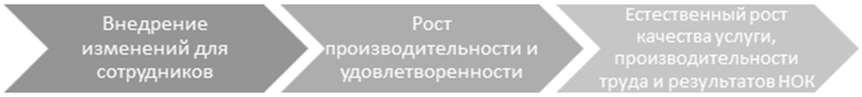 Пересмотр логистики в организации, указание маршрута, таблички идентификации различных зон и кабинетов, оборудование зон ожидания и др. помогли повысить комфортность и удобство ожидания и сократить время на поиск кабинетов. Внедренные мероприятия помогли повысить производительность труда, сокращая затраты времени сотрудников и посетителей, увеличивая пропускную способность организации. А также в значительной степени позволили улучшить результаты НОК в части повышения оценки по критериям, связанным с повышением комфортности, а также удовлетворенности получателей услуг.
