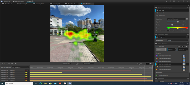 На третьем этапе исследования собранные данные были обработаны при помощи программного продукта Tobii PRO LAB. На основании проведенного анализа были сформулированы выводы и рекомендации, связанные с повышением визуального внимания и вовлеченности, и снижения когнитивной нагрузки в процессе взаимодействия участников эксперимента с тестируемой рекламной конструкцией.
