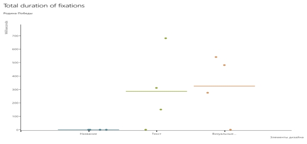 Визуализация общей продолжительности фиксации на выделенных элементах тестируемой рекламной конструкции (заголовок, текст, визуальные элементы), например, для лайтбокса «Родина победы» представлены на рисунке 8.