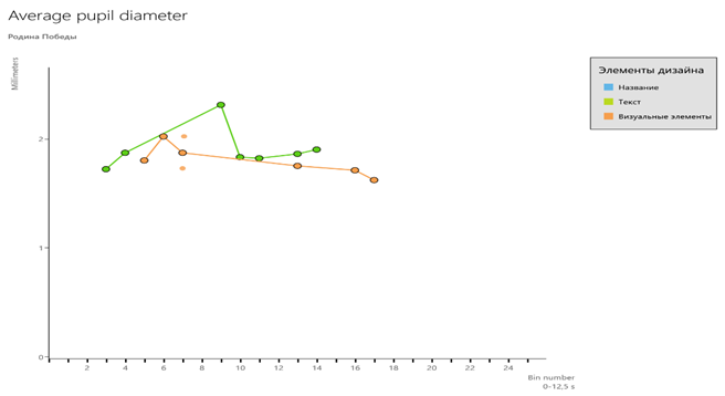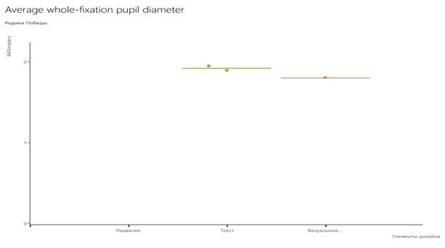 Согласно представленным данным видно, что незначительный эмоциональный отклик вызвал просмотр текста, и в меньшей степени визуальные элементы латбокса Родина победы. Средний диаметр зрачка при полной фиксации (Average Whole Fixation Pupil Diameter) при просмотре элементов тестируемого лайтбокса Родина победы представлен на рисунке 11.