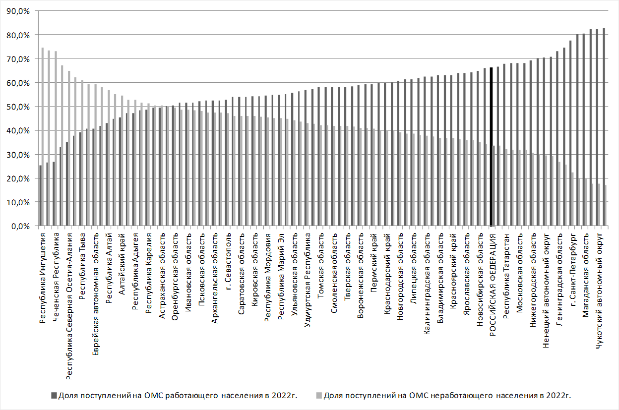 Рис. 1. Поступления на ОМС работающего и неработающего населения в регионах РФ в 2022 г. (% всех поступлений, данные ФФОМС, ТФОМС)