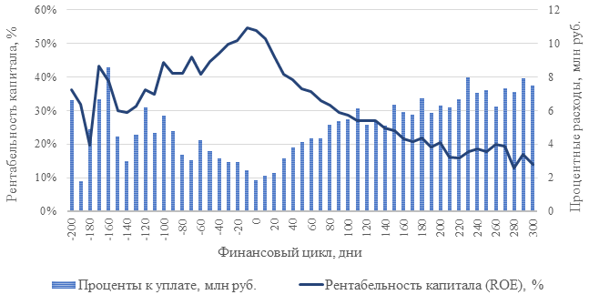 Графический анализ (рис. 1) эмпирических данных российских МСП показывает, что рентабельность собственного капитала достигает максимальных значений при умеренной продолжительности финансового цикла. По мере увеличения или снижения финансового цикла одновременно с этим наблюдается рост процентных расходов. Это указывает на растущую потребность во внешнем финансировании, что ведет к снижению рентабельности собственного капитала и заставляет МСП искать баланс между обеспечением ликвидности и минимизацией затрат на финансирование.