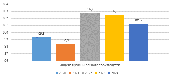 Начиная с 2022 года промышленность региона демонстрирует устойчивый рост. Значения индекса составили 102,8% (2022 г.), 102,5% (2023 г.) и 101,2% (2024 г.). Это свидетельствует о стабильном развитии отрасли и преодолении кризисных явлений первых двух лет рассматриваемого периода.