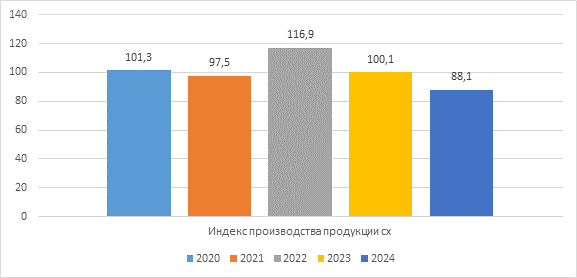 Динамика индекса производства сельскохозяйственной продукции характеризуется нестабильностью и чередованием периодов умеренного роста, значительного увеличения и существенного снижения объемов выпуска. Особенно тревожным выглядит резкое падение производства в 2024 году, которое требует пристального внимания и принятия мер для стабилизации и дальнейшего развития агропромышленного комплекса.