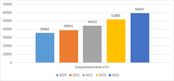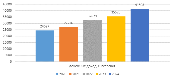 Анализ статистических данных показывает устойчивый тренд увеличения среднедушевых денежных доходов населения в месячном исчислении в течение временного интервала от 2020 до 2024 года включительно. Так, стартовый уровень данного показателя составлял приблизительно 24 тысячи рублей на начало исследуемого периода, демонстрируя последовательный восходящий вектор развития вплоть до достижения величины порядка 45 тысяч рублей к концу указанного отрезка времени. Полученные результаты свидетельствуют о позитивной тенденции долгосрочного повышения уровня реальных располагаемых доходов граждан рассматриваемой территории.