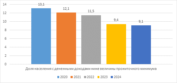 Рисунок 9 - Доля населения с денежными доходами ниже величины прожиточного минимума в Волгоградской области, процент от общей численности населения [16]