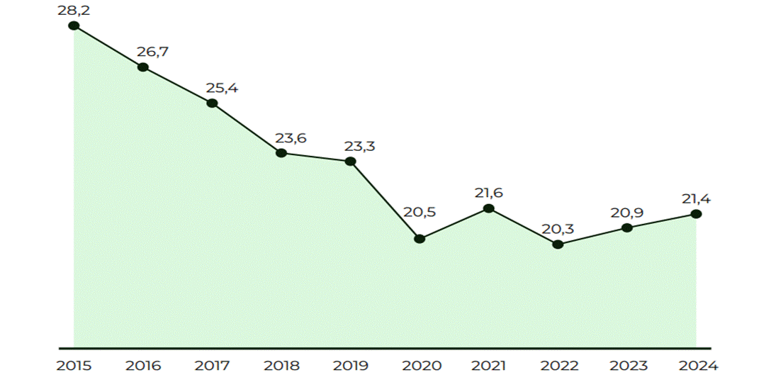 Доля несчастных случаев с тяжелыми последствиями на предприятиях высокого риска с 2019 года по 2024 гг. снизилась с 38,9% до 32,1% (рис. 2).