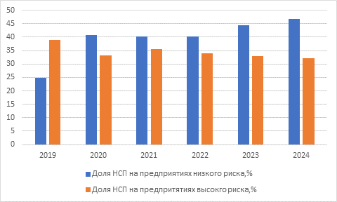Наибольшая доля НСП наблюдается на предприятиях с низким уровнем риска, что может быть обусловлено низкой частотой внешнего аудита и слабой системой охраны труда, в то время как для крупных предприятий с высоким уровнем риска проверки проводятся не реже одного раза в год.