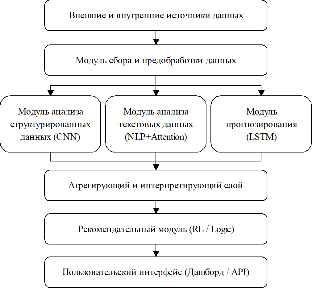 Для проведения эксперимента использовалась гибридная нейросетевая модель поддержки принятия решений, архитектура которой была разработана с учетом выявленных в ходе анкетирования требований бизнеса: ориентация на объяснимость, модульность и возможность адаптации. Модель сочетает рекуррентные (LSTM) и сверточные (CNN) нейросети для анализа структурированных данных и временных рядов, а также «механизмы внимания» и NLP-модули для обработки текстовой информации, что обеспечивало комплексный анализ факторов риска (Рис. 1). Важной особенностью системы, для преодоления эффекта «черного ящика», являлась её способность визуализировать ключевые факторы, повлиявшие на рекомендацию.