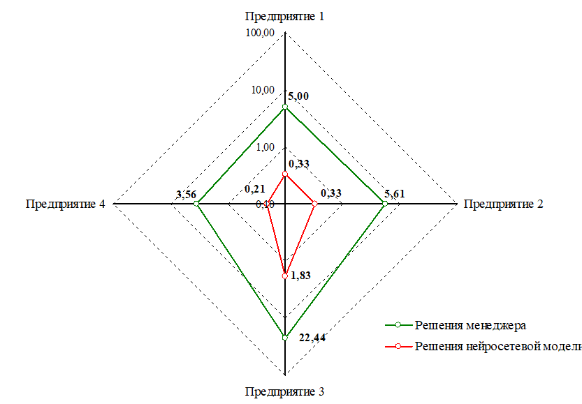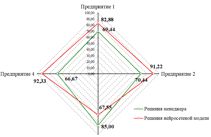 Отображённые на рисунке 4 данные демонстрирую избирательную эффективность нейросетевой модели. На предприятиях с формализуемыми процессами («Предприятие 1», «Предприятие 2», «Предприятии 4») модель демонстрирует значительное превосходство, особенно в задачах риск-менеджмента («Предприятие 4»). Однако в творческо-производственной сфере («Предприятие 3») решения, основанные на глубоком субъективном опыте менеджера, остаются более эффективными, что свидетельствует о том, что нейросетевая модель является хоть и весьма мощным, но всего лишь инструментом для анализа данных, и на данном уровне развития, пока ещё не может заменять человеческую интуицию в слабоструктурированных ситуациях.