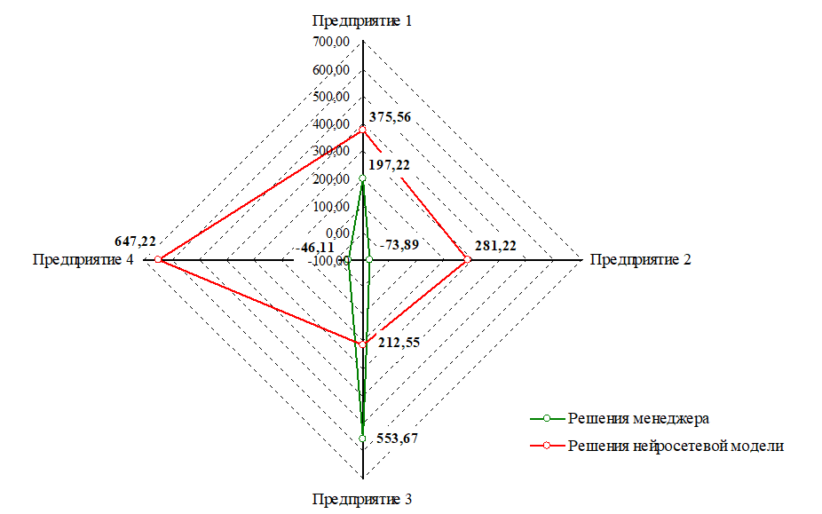 На рисунке 4 отображены сведения о средней величине финансового результата принимаемых менеджерами и нейросетевой моделью управленческих решений.