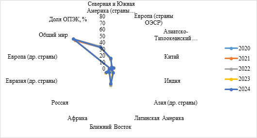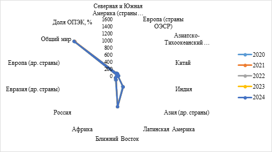 Как видно из рисунка 1, доля экспорта стран ОПЕК за анализируемый период 2020-2024 гг. отмечена в диапазоне 43,96-46,64%%, свидетельствуя о значительном влиянии организации на мировой нефтяной рынок. Несмотря на снижение значений показателя в 2023-2024 гг., экспортная доля ОПЕК сохранилась на высоком уровне. Основными регионами, формирующими общий мировой объем экспорта, выступают Ближний Восток и страны ОЭСР [2] Северной и Южной Америки. Страны ОЭСР Европы и Азиатско-Тихоокеанского региона (АТР) характеризуются относительно стабильными, но сравнительно невысокими объемами. В то же время Россия и другие государства Евразии обеспечивают существенный вклад, однако их доля ниже, чем у стран ОПЕК.