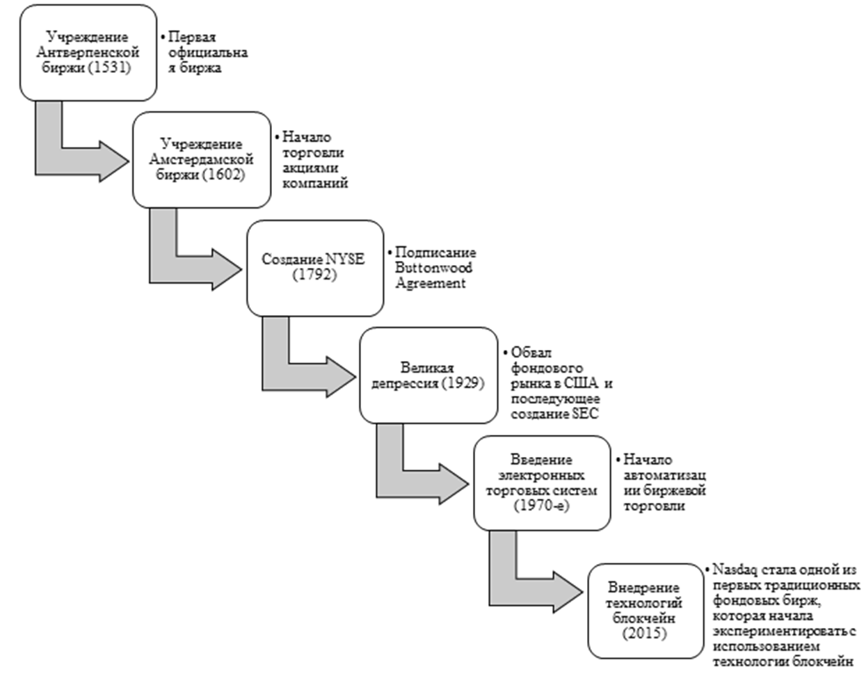 Фондовый рынок является важнейшим составным элементом финансовой системы современного государства. История развития фондовых бирж достаточно продолжительна. Наиболее знаковые события, существенно повлиявшие на развитие фондовых бирж, отражены на рисунке 1.