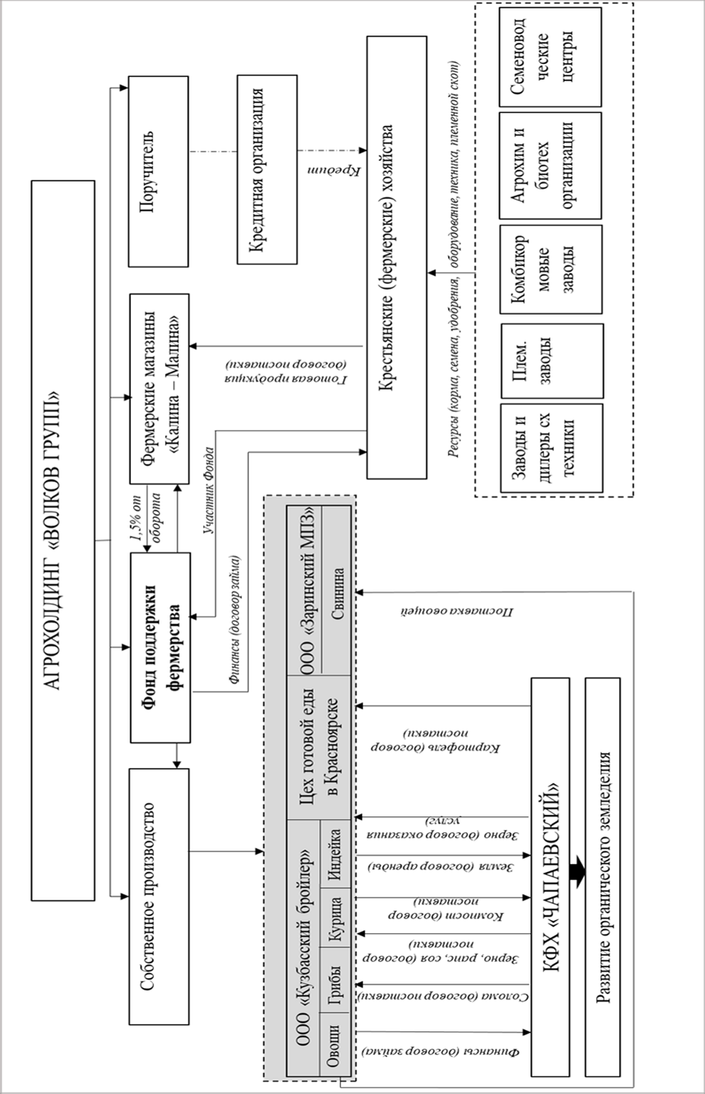 В рамках реализации предложенного автором механизма взаимодействия крестьянских (фермерских) хозяйств с крупными сельскохозяйственными организациями в регионе функционирует «Фонд поддержки фермерства» г. Кемерово, учрежденный агрохолдингом «Волков Групп» (рисунок 2). В Фонд поступают отчисления в размере 1,5% от оборота продукции Участников Фонда, реализованной в торговой сети «Калина-Малина». Основной целью деятельности Фонда является поддержание инициатив по дальнейшему развитию его участников и обеспечение комфортных условий для производства натуральной, экологически безопасной и качественной продукции. Фермерские хозяйства могут принимать участие в деятельности Фонда в качестве Участника на основании заключенных договоров поставки продукции для фирменных отделов «Калина-Малина». Фонд предоставляет фермерам беспроцентные займы до 5 млн руб., погашение которых осуществляется поставкой продукции в сеть магазинов «Калина-Малина».
