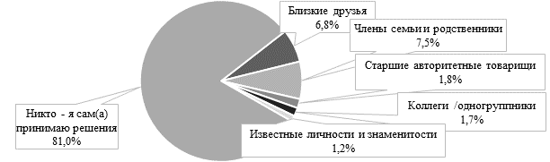 На прямой вопрос: «Кто, по Вашему мнению, мог бы повлиять на Ваше решение учувствовать в дроп-схемах?» большинство респондентов (81,0%) ответили, что никто не сможет вовлечь их в дроп-схемы. Лишь 19,0% осознано говорят о том, что подвержены влиянию третьих лиц из ближайшего окружения: членов семьи и родственников, близких друзей, коллег и одногруппников, старших и более авторитетных товарищей (Рис. 2). Из них 2,4% респондентов заявляют о готовности присоединиться к противоправным действиям «при условии коллективного участия всех членов их компании». Можно сделать вывод, что внутри закрытых, доверительных социальных групп деструктивные модели поведения могут распространяться неявно, минуя их критическую оценку. Данный тезис находит подтверждение в работе Огунлей Й., Оджедокун У., Адеринто А. [13, с. 321–322] (Ogunleye, Ojedokun, Aderinto, 2020). Согласно концепции социального научения [14] (Opp, 2020) девиантное поведение усваивается через взаимодействие именно в первичных группах. Таким образом, круг общения, будучи источником норм и моделей поведения, оказывается следующим социально-психологическим фактором риска.