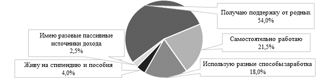 Финансово-экономические факторы и причины вовлечения молодежи в дроп-схемы. Финансовое положение является одним из главных экономических драйверов вовлечения молодежи в дроп-схемы. По данным опроса 54,0% респондентов получают поддержку от родителей, что характеризует финансовую зависимость от своих семей и подчеркивает наличие серьезной социальной и экономической уязвимости. Самостоятельно зарабатывают лишь 21,5% молодежи, преимущественно возраста 20-24 лет. Остальные источники дохода (стипендии, пособия, пассивные доходы) хотя и обеспечивают незначительную «финансовую подушку», но не являются стабильными, не создают надежной базы для долгосрочного финансового благополучия (Рис. 3).