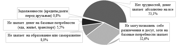 При анализе текущих финансовых потребностей молодежи, установлено, что 53,1% опрошенных не испытывают существенных финансовых трудностей. Этот показатель намного ниже, чем доля респондентов, которые работают и получают финансовую поддержку от родных. То есть наблюдается диспропорция в объемах финансирования и потребностях молодежи. В то же время, 32,6% респондентов заявили, что покрывают базовые финансовые потребности, но не могут позволить себе развлечения и досуг. Ограниченные финансовые возможности у 13,5 % респондентов, которые не могут позволить себе даже финансирование образования и базовых потребностей (Рис. 4).