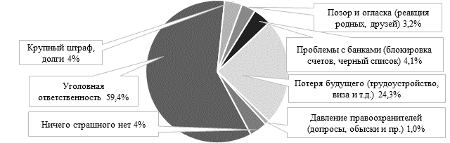 Следующий по значимости страх - потеря будущего (24,3%). Молодые люди боятся социальных последствий: краха карьеры, невозможности получить визу. Общественное порицание, упреки родственников и друзей (3,2%), давление правоохранителей (1,0%), блокировки счетов (4,1%) и штрафы (4,0%) не так сильно пугают молодежь. Это говорит о том, что социальное осуждение и процесс следствия сами по себе не являются для них значимыми сдерживающими факторами. Самая тревожная группа - это 4,0% респондентов, которые готовы пойти на риск, невзирая на последствия.