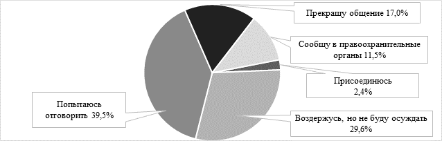 Меры реагирования молодежи на ситуацию втягивания в дроп-схемы близкого окружения отражают точку принятия решения и не отличаются единством. Исследование показало, что 2,4% респондентов готовы участвовать в дроп-схемах совместно со своими вовлеченными друзьями. В то же время большинство опрошенных (39,5%) намерены отговорить своих знакомых от участия в подобных схемах, но не принимать иных активных действий. Воздержатся от любых действий - 29,6% респондентов. Лишь 17,0% готовы прекратить общение с друзьями, вовлеченными в дроп-схемы, а 11,5% обратились бы в правоохранительные органы по поводу незаконной деятельности друзей и знакомых.